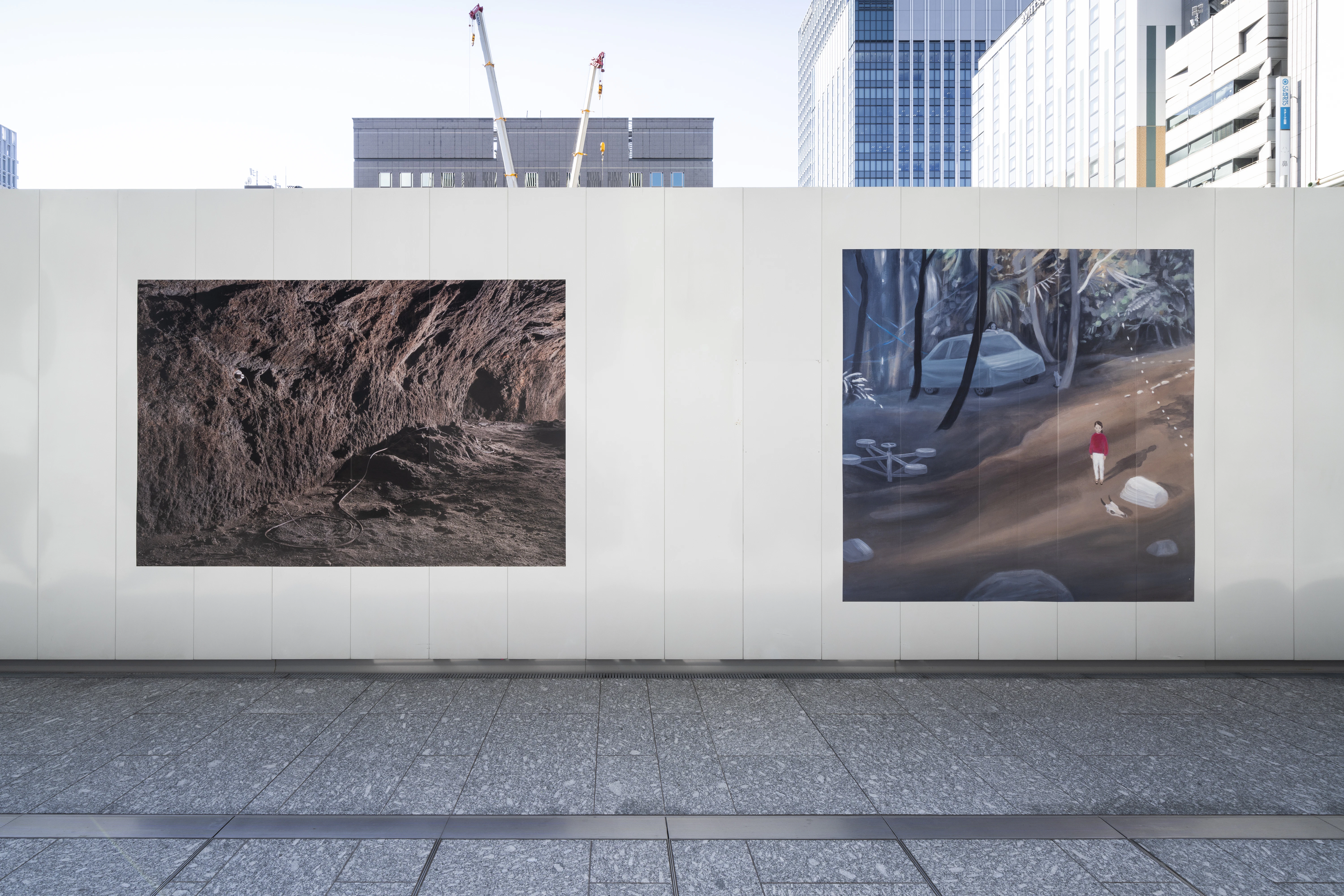 今回の優秀作品2点に共通しているのは、空間と時間の特殊性。コケシスキーさんの絵画作品「Hole」では、少女を取り巻く森のような自然と、クルマや遊具のような人工物、鹿の骨があり、時空をこえるスポットのような風景が展開されています。佐々木香輔さんの写真作品「space -under the ground-」では、戦時中に作られた地下壕の空間に、最新の地震計測装置が設置されている風景が広がり、時代とともに変容する地下に広がる空間が照らしだされています。どちらの作品も、京橋という街の壁面に、現実から違う世界につながる場所を提示してくれるように思います。