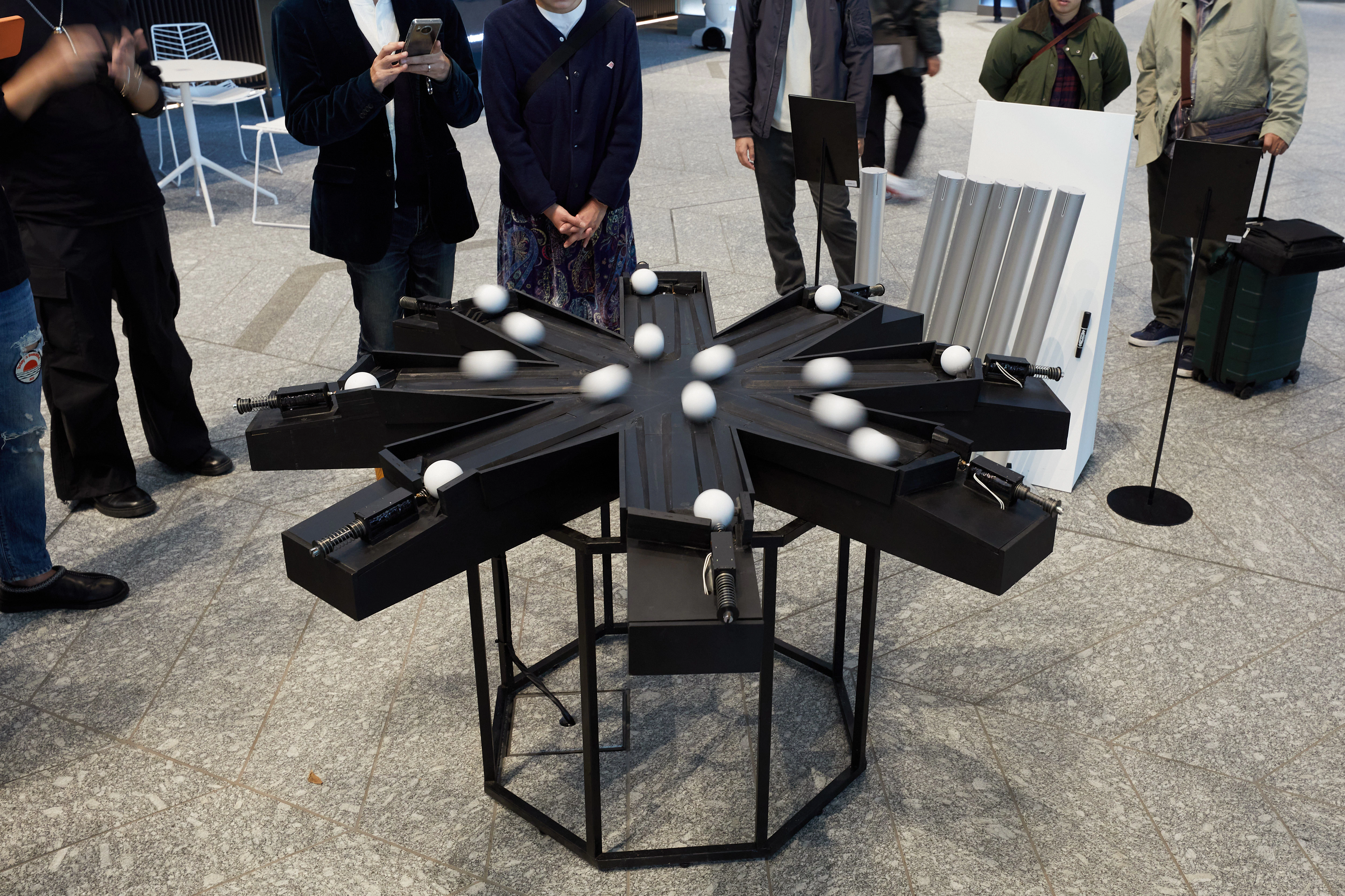 八方向から伸びる木製レールが中央で交差し、16の球が規則正しく行き交う。